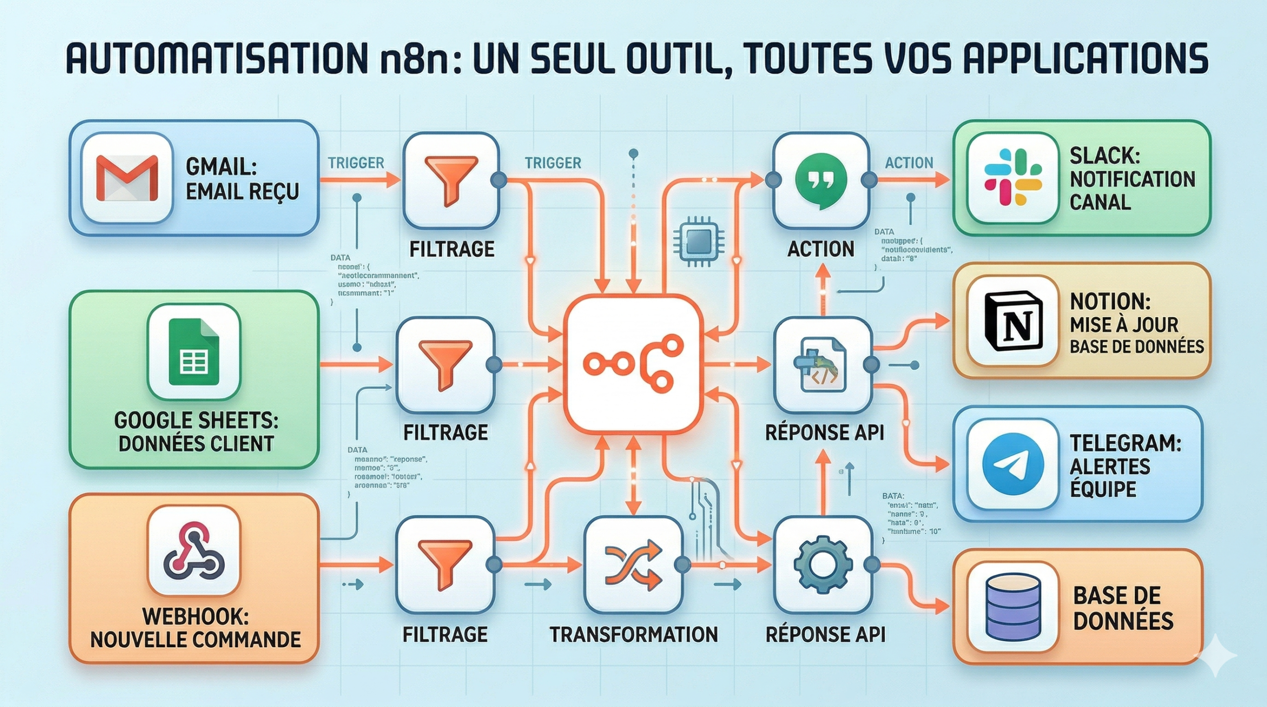 Emails de relance automatiques, synchronisation entre vos outils, notifications, rapports hebdomadaires — tout ce que vous faites à la main, fait tout seul.