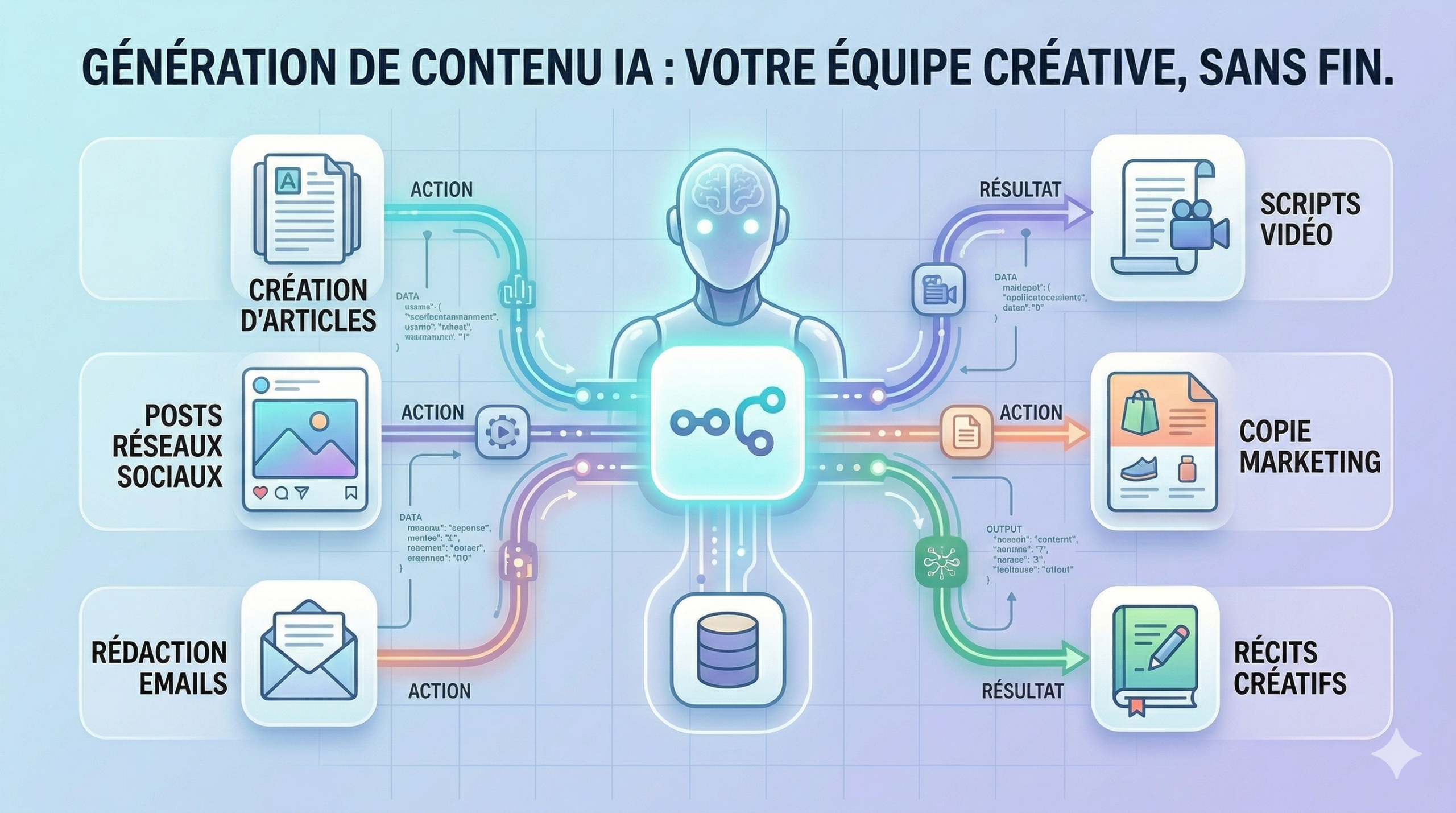 Posts LinkedIn, newsletters, descriptions produits, articles de blog — générés par IA dans votre ton, prêts à valider en quelques minutes.