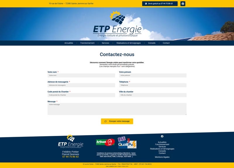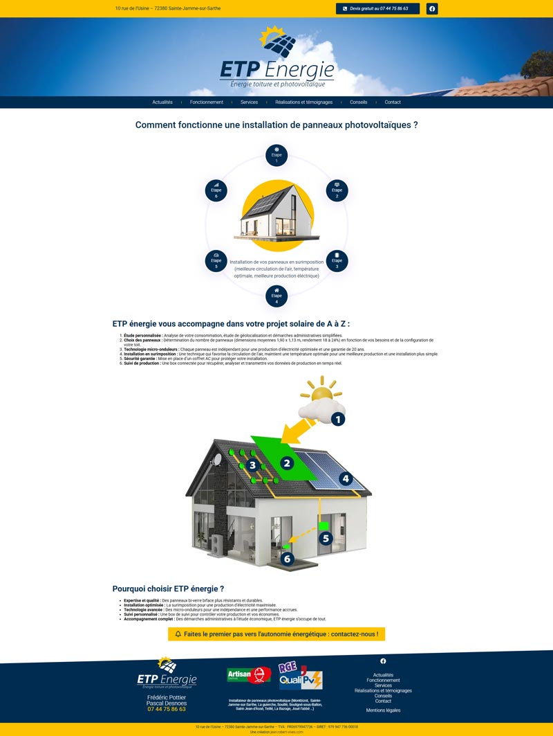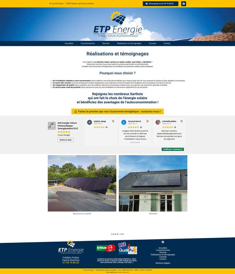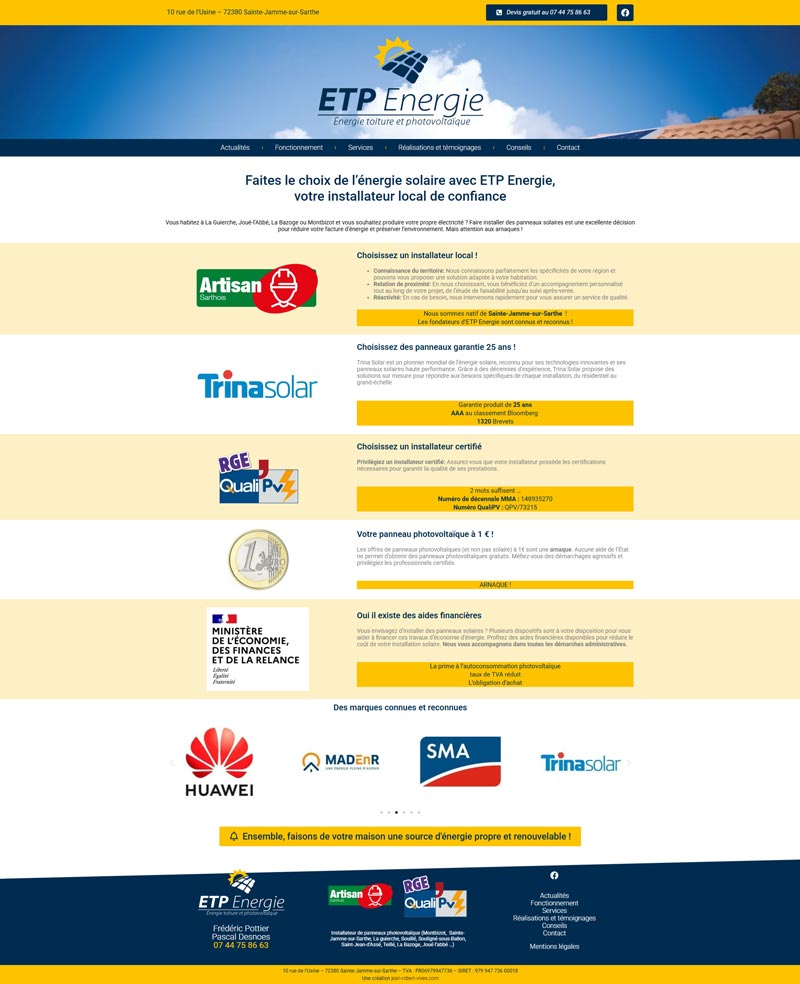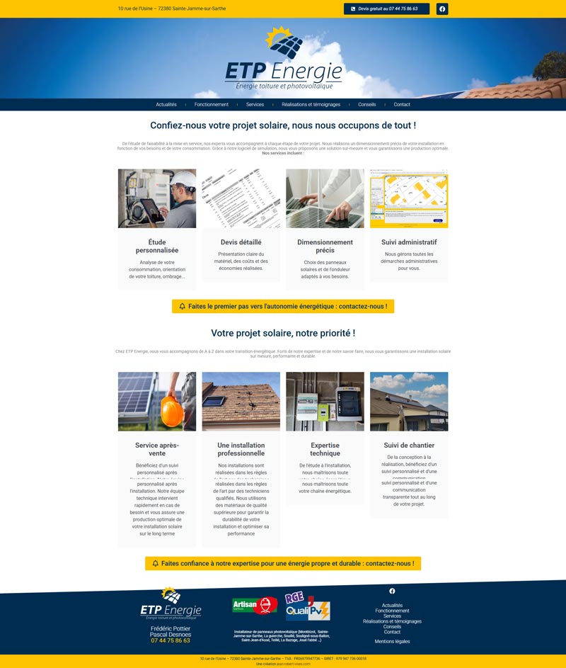 Ce projet consistait en la conception et la réalisation du site internet ETP Énergie, un installateur local de panneaux photovoltaïques en Sarthe (72). L’objectif est de présenter les services de l’entreprise, établir la confiance et générer des demandes de devis qualifiées.